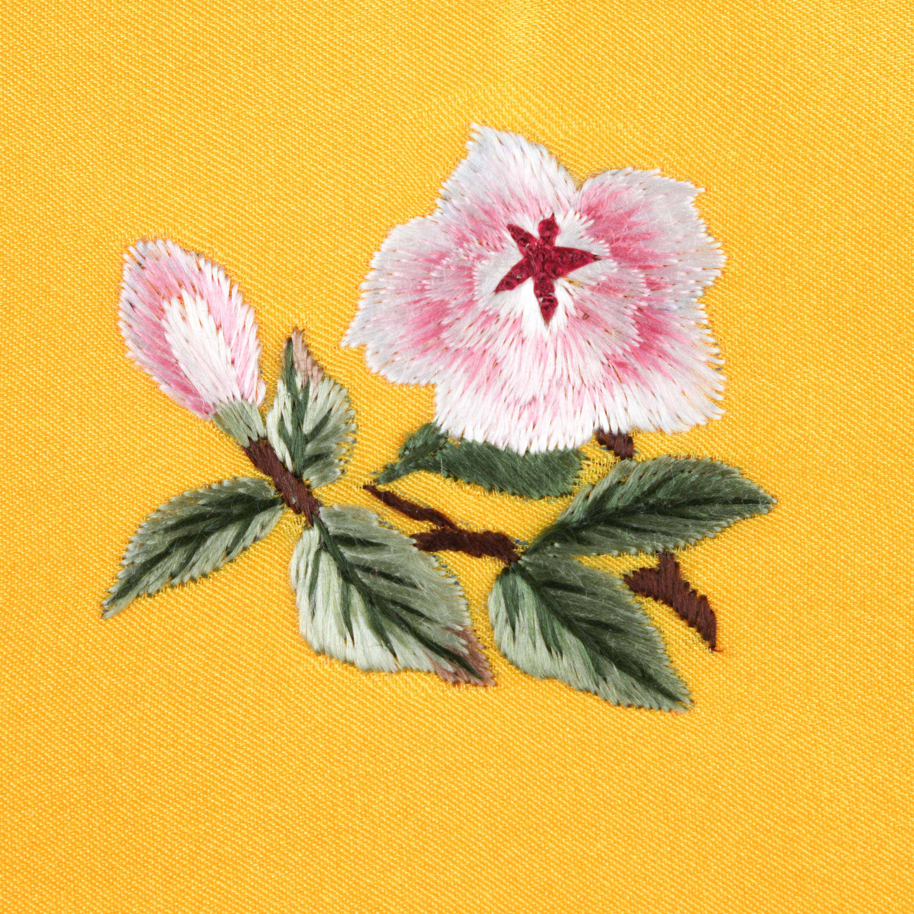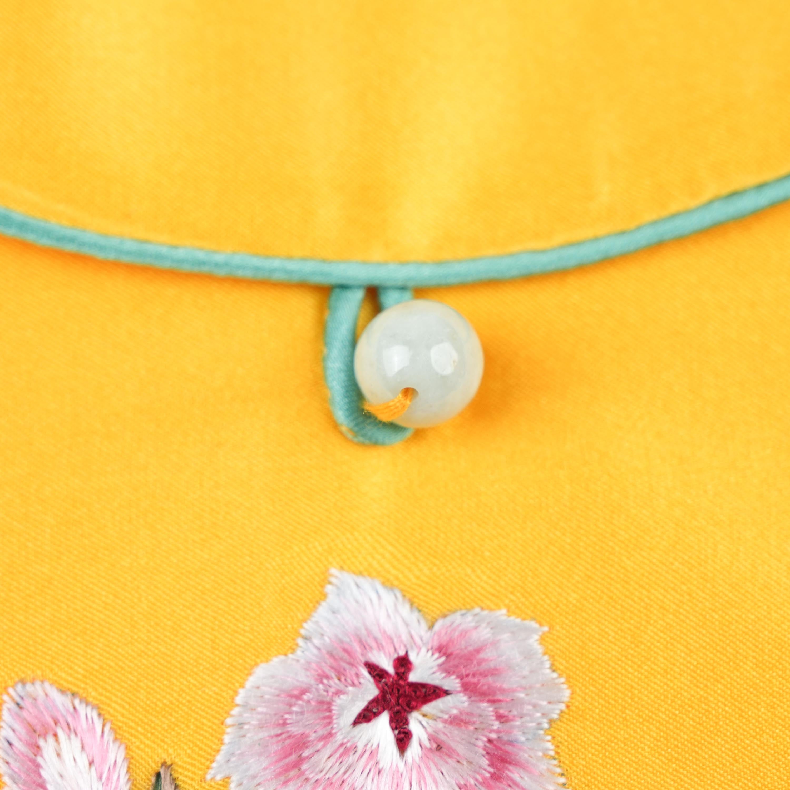 Materials & Size - Shell: 100% silk with hand embroidery; Lining: 100% silk; Jade-style clasp. Approx. 12 × 14 cm. Colour/Finish: Bright Yellow.